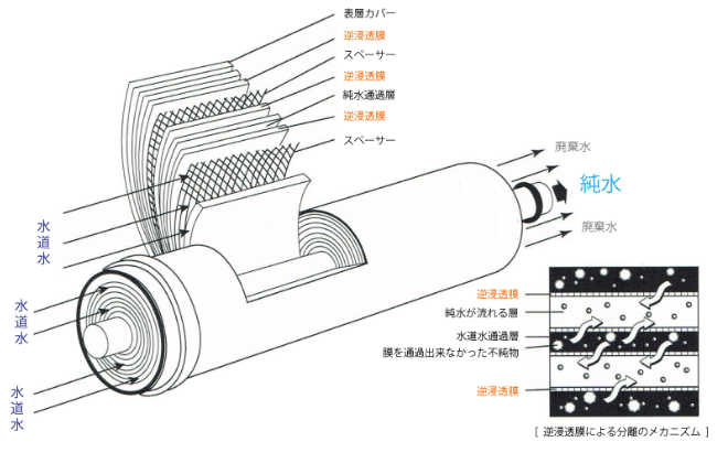 この膜は、様々な物質が含まれている原水から水分子のみを通過させ、その他溶け込んでいる物質を通さないという透過機能を持っています。